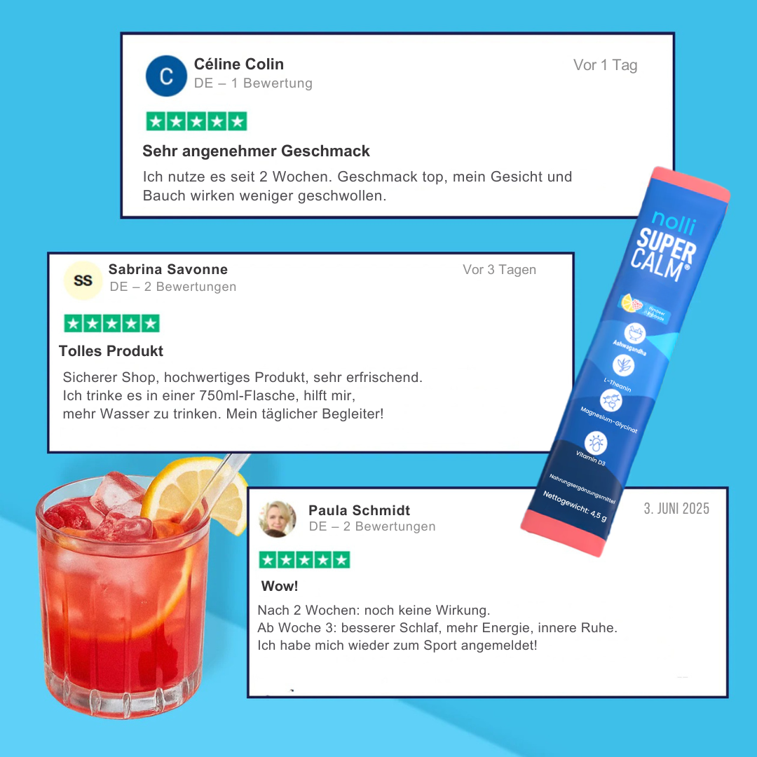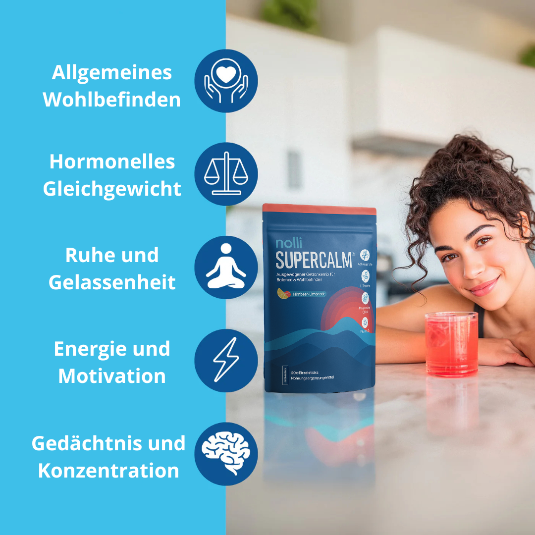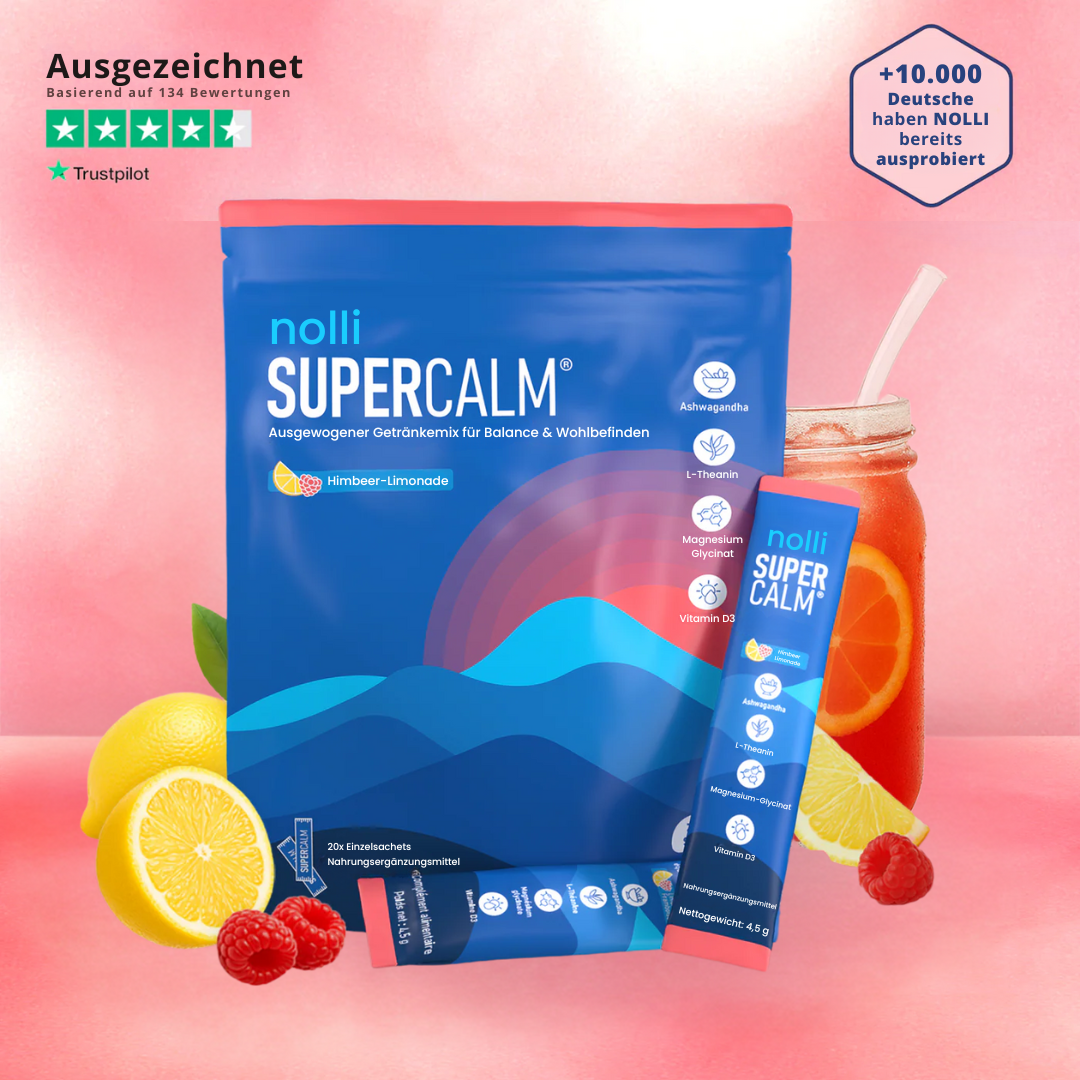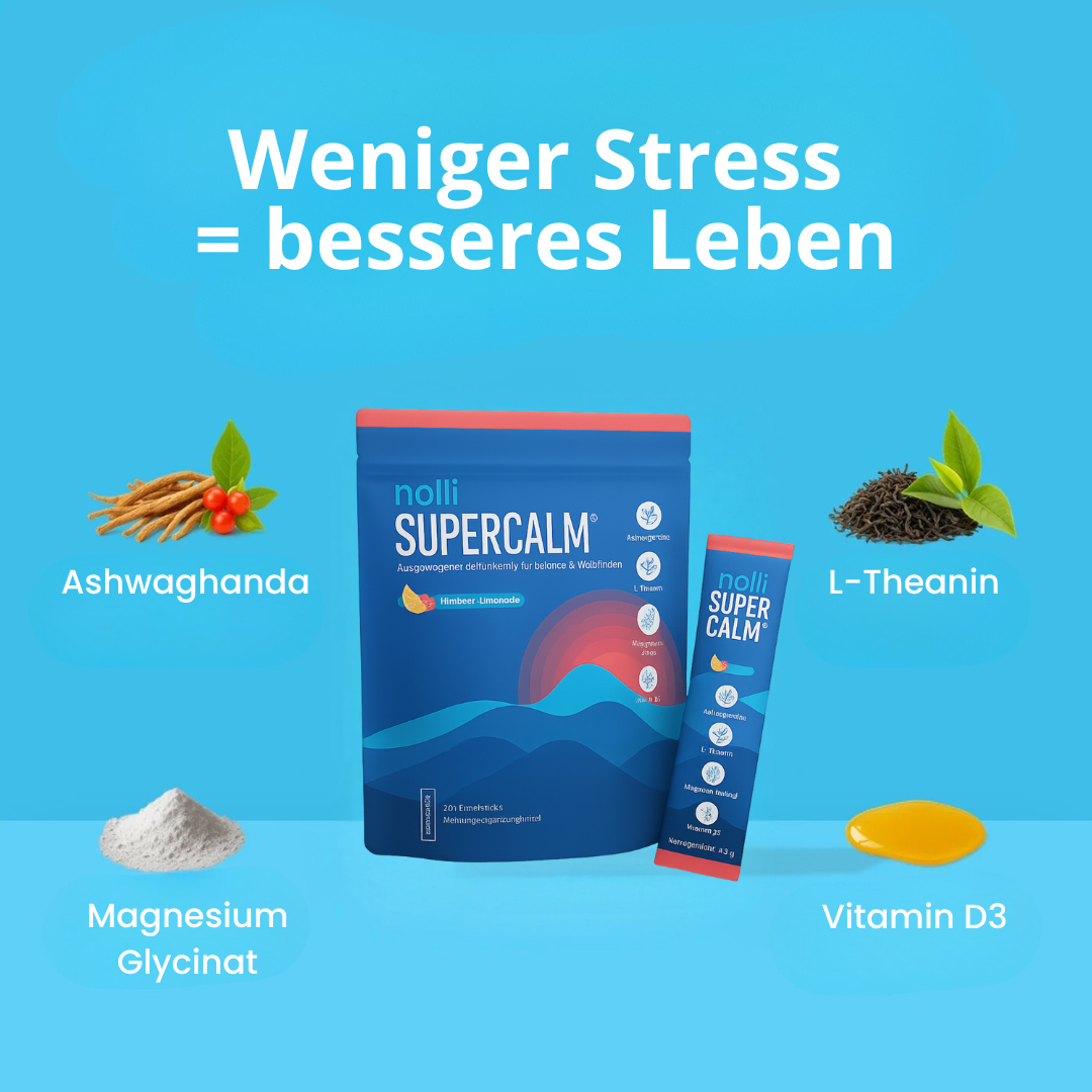 Zusammengefasst: nolli bekämpft die negativen Folgen von Stress, indem es direkt die Ursachen anspricht: hoher Cortisolspiegel, hormonelle Dysbalancen, schlechter Schlaf und chronische Erschöpfung. Jede Zutat spielt eine präzise Rolle, um Körper und Geist wieder ins Gleichgewicht zu bringen – für mehr Energie, Ruhe und Wohlbefinden im Alltag.