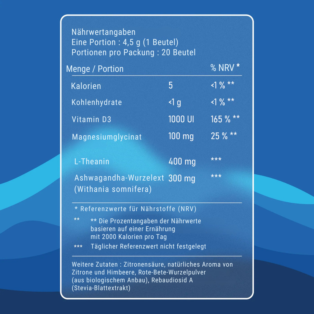 Chronischer Stress erhöht mentale Unruhe und Anspannung – was das Einschlafen erschwert und die Schlafqualität mindert. nolli enthält Magnesium Glycinat und L-Theanin, zwei beruhigende Wirkstoffe, die helfen, Körper und Geist zu entspannen und einen erholsamen Schlaf zu fördern.